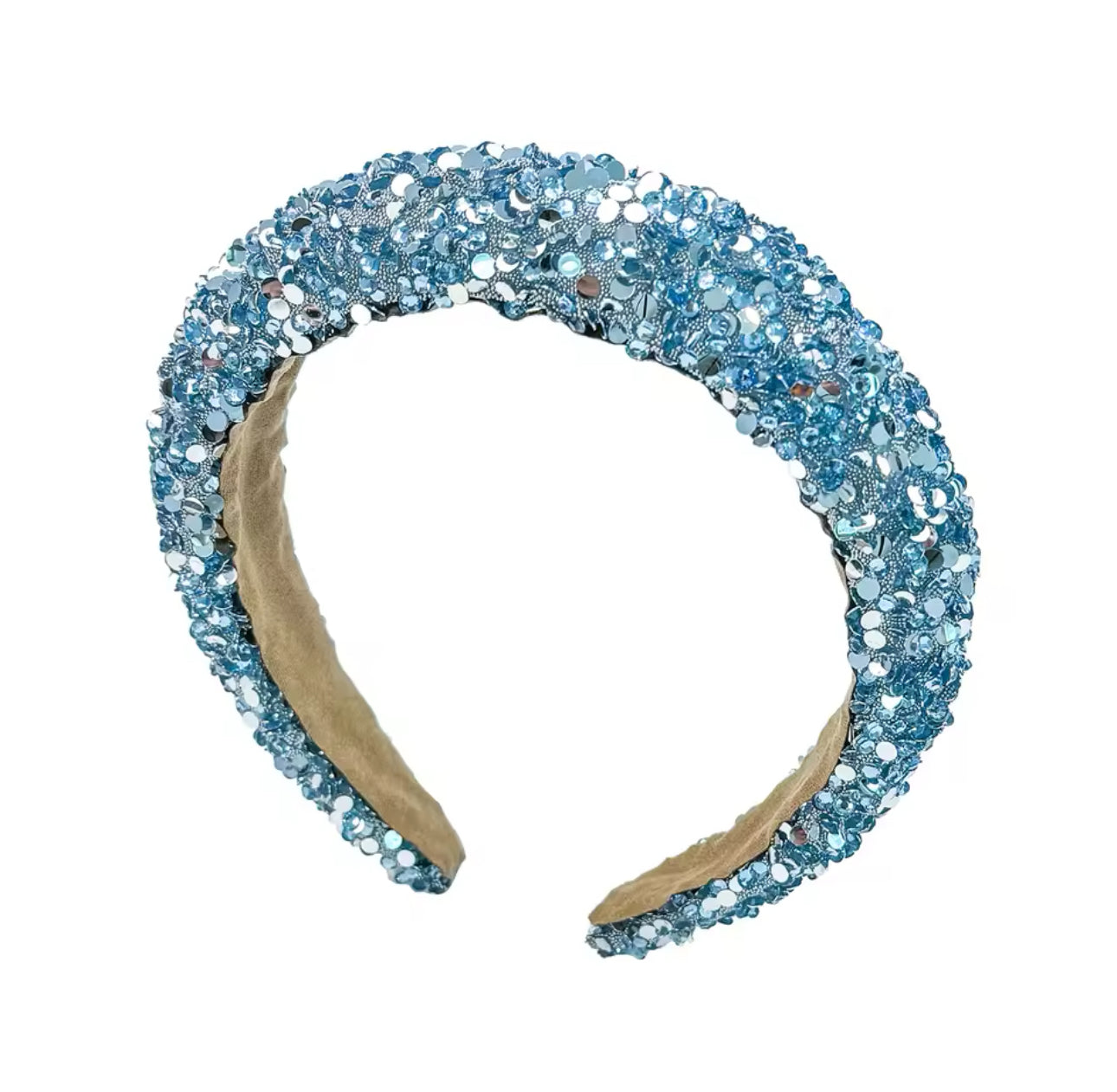 Dale un toque de elegancia y brillo a cualquier look con nuestro cintillo glamour brillante. Este accesorio de lujo está diseñado con una base acolchada para máxima comodidad y cubierto con detalles de pedrería y lentejuelas que reflejan la luz de manera espectacular.