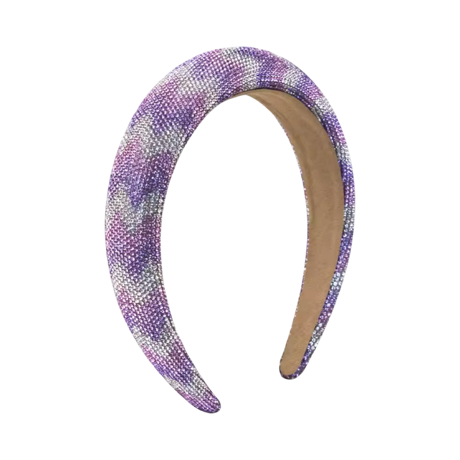 Este cintillo es el complemento perfecto para quienes buscan un toque de sofisticación y brillo en su estilo. Con un diseño acolchado y curvado, ofrece comodidad y un ajuste seguro. Está decorado con pequeños cristales en tonos morado y plateado, creando un efecto deslumbrante que capta la luz desde cualquier ángulo.