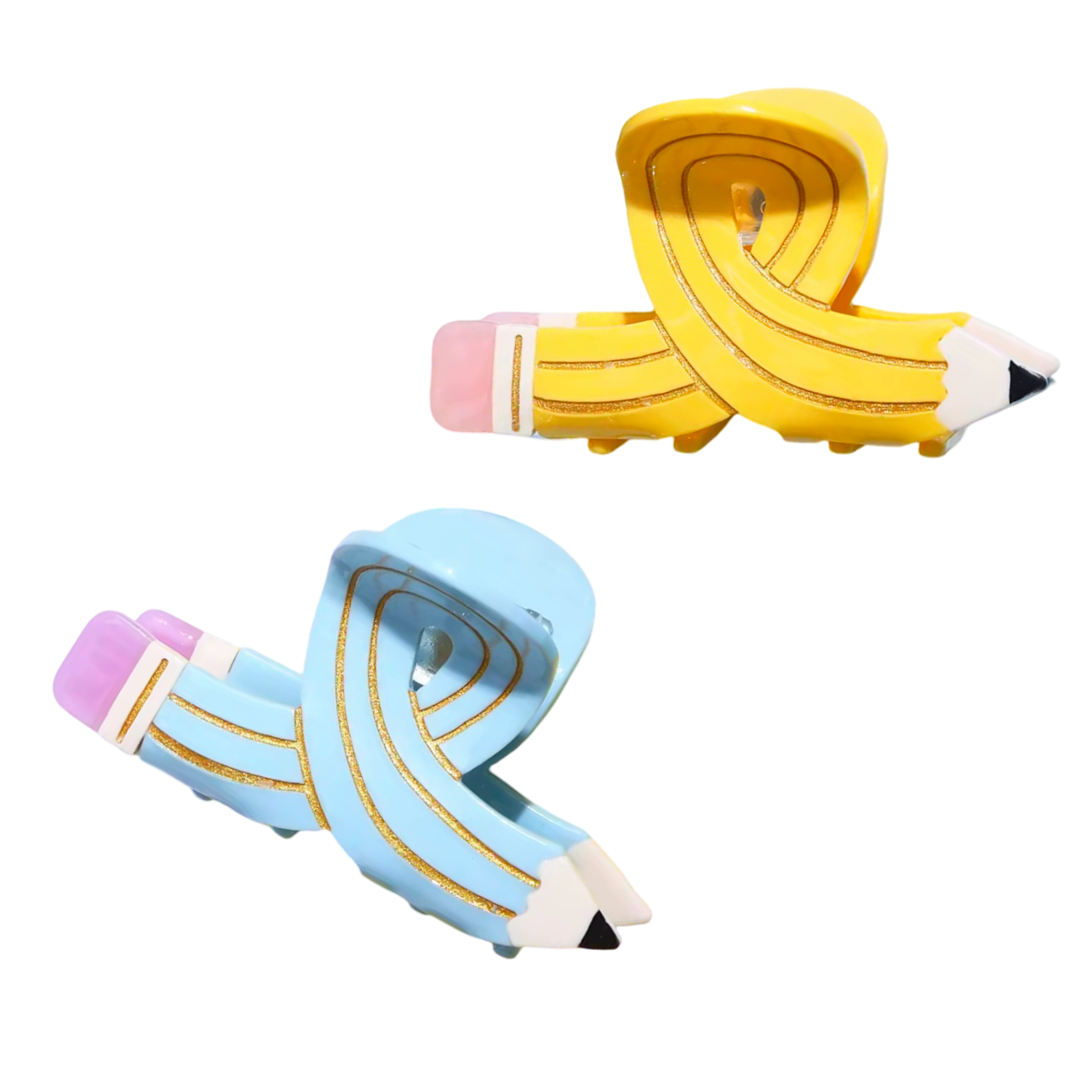 Este gancho para el pelo tiene un diseño creativo y divertido en forma de lápiz enrollado, disponible en colores amarillo y azul pastel. Está decorado con detalles dorados que resaltan su estilo único, junto con una goma de borrar en tonos rosados y una punta afilada que imita un lápiz real. Hecho de material resistente y ligero, es ideal para sujetar el cabello con firmeza mientras añade un toque original y colorido a cualquier look. Perfecto para estudiantes, artistas o amantes de los accesorios con temática escolar.