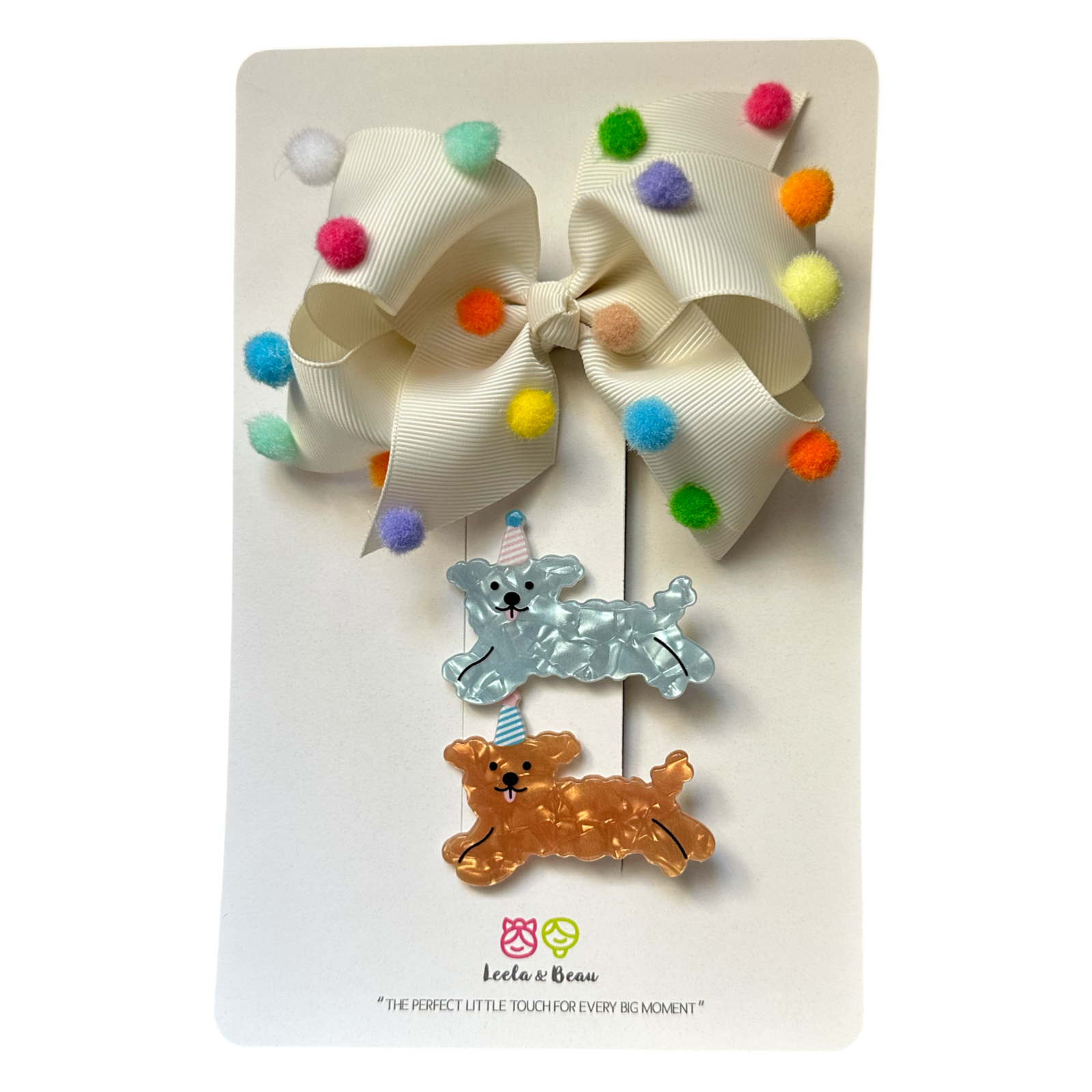 Añade un toque de diversión y ternura a cualquier peinado con este encantador set de accesorios para el cabello. Incluye dos ganchitos pequeños en forma de perritos con gorrito de fiesta, en tonos metálicos que aportan un brillo especial. Además, viene acompañado de un lazo grande en color crema decorado con pompones multicolor, ideal para darle un toque alegre y festivo a cualquier look. Perfecto para ocasiones especiales o simplemente para agregar un detalle juguetón al día a día.
