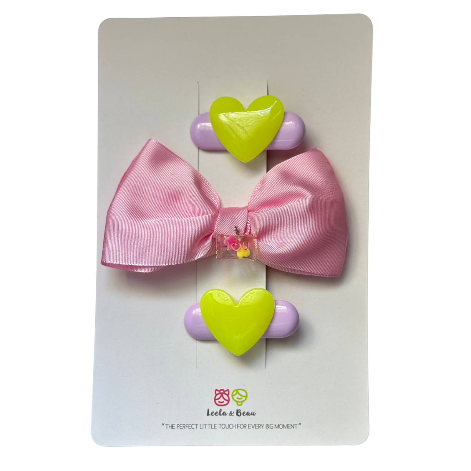 Dale un toque dulce y vibrante a tu peinado con este set de accesorios para el cabello. Incluye un lazo rosa con un delicado dije "I ❤️ U" y dos clips con corazones en color amarillo neón y detalles lila. Perfecto para un look romántico y moderno. ¡Un must-have para cualquier ocasión especial! 💖✨