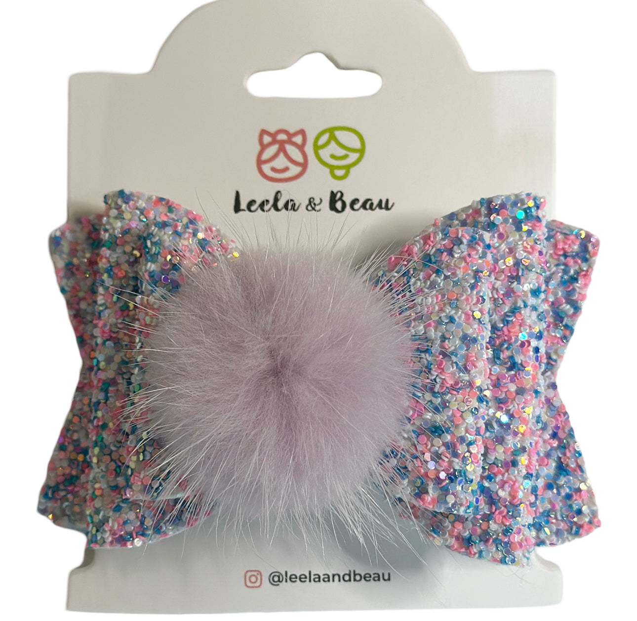 Este lazo está cubierto de escarcha multicolor y decorado con un suave pompón en el centro, creando un look único y encantador. Su clip antideslizante garantiza una sujeción segura y cómoda.