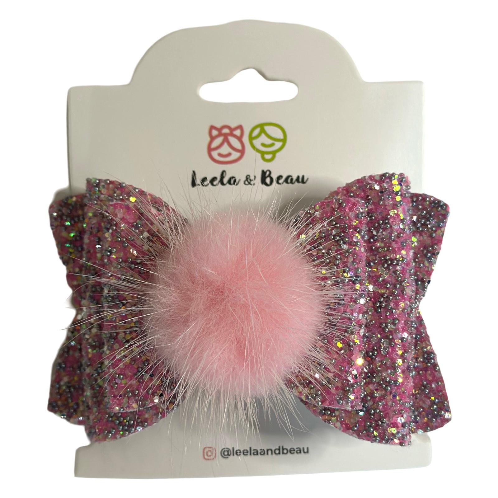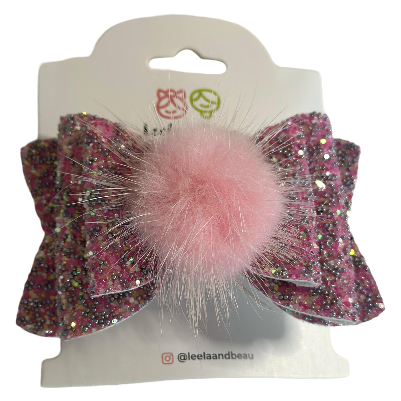 Este lazo está cubierto de escarcha multicolor y decorado con un suave pompón en el centro, creando un look único y encantador. Su clip antideslizante garantiza una sujeción segura y cómoda.