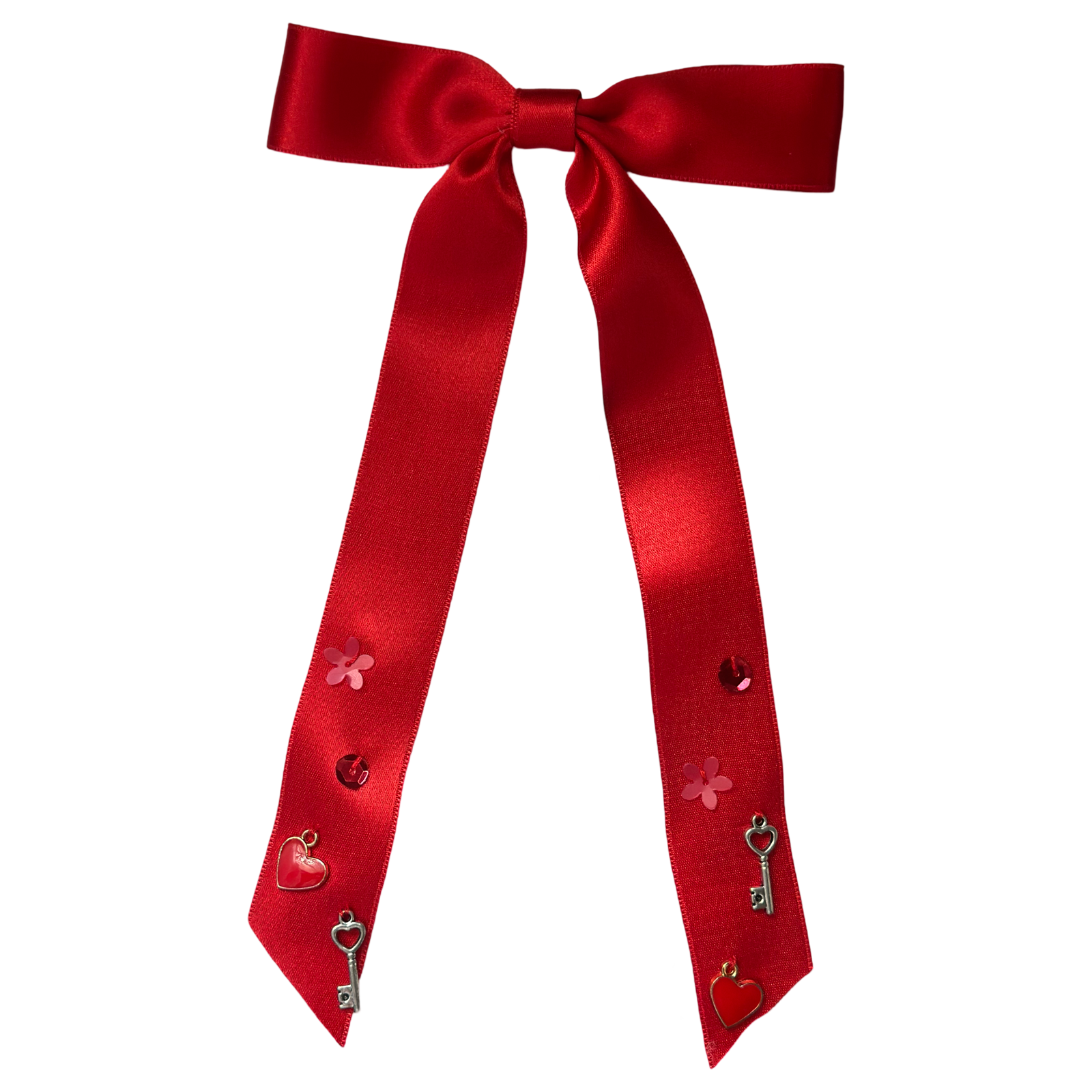 Este elegante lazo de seda con corazones, llavesitas y flores bordados a mano es el accesorio perfecto para un toque romántico y sofisticado. Su diseño largo y detallado resalta cualquier peinado, mientras que el clip antideslizante garantiza una sujeción firme y cómoda. Ideal para ocasiones especiales o para añadir un detalle encantador a tu look diario. ❤️✨
